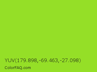 YUV 179.898,-69.463,-27.098 Color is a normal green color and the nearest color is Atlantis #97cd2d. Hex code #95df27 and RGB value is rgb(149,223,39). In RGB color space, this color is composed of 58% red, 87% green, 15% blue, In CMYK color space, this color is composed of 33% cyan, 0% magenta, 83% yellow , 13% black , In HSL color space, this color has a hue angle of 84° , 74% saturation and 51% lightness.