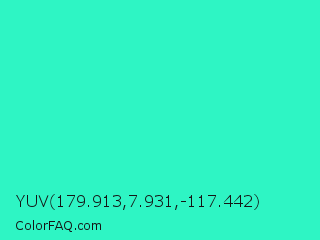 YUV 179.913,7.931,-117.442 Color is a normal cyan color and the nearest color is Turquoise #40e0d0. Hex code #2ef5c4 and RGB value is rgb(46,245,196). In RGB color space, this color is composed of 18% red, 96% green, 77% blue, In CMYK color space, this color is composed of 81% cyan, 0% magenta, 20% yellow , 4% black , In HSL color space, this color has a hue angle of 165° , 91% saturation and 57% lightness.