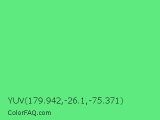YUV 179.942,-26.1,-75.371 Color is a light green color and the nearest color is Very Light Malachite Green #64e986. Hex code #5eea7f and RGB value is rgb(94,234,127). In RGB color space, this color is composed of 37% red, 92% green, 50% blue, In CMYK color space, this color is composed of 60% cyan, 0% magenta, 46% yellow , 8% black , In HSL color space, this color has a hue angle of 134° , 77% saturation and 64% lightness.