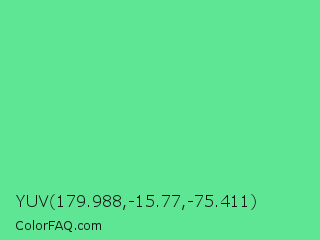 YUV 179.988,-15.77,-75.411 Color is a light green color and the nearest color is Very Light Malachite Green #64e986. Hex code #5ee694 and RGB value is rgb(94,230,148). In RGB color space, this color is composed of 37% red, 90% green, 58% blue, In CMYK color space, this color is composed of 59% cyan, 0% magenta, 36% yellow , 10% black , In HSL color space, this color has a hue angle of 144° , 73% saturation and 64% lightness.