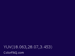 YUV 18.063,28.07,3.453 Color is a very dark indigo color and the nearest color is Tolopea #1b0245. Hex code #16054b and RGB value is rgb(22,5,75). In RGB color space, this color is composed of 9% red, 2% green, 29% blue, In CMYK color space, this color is composed of 71% cyan, 93% magenta, 0% yellow , 71% black , In HSL color space, this color has a hue angle of 255° , 88% saturation and 16% lightness.