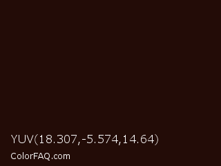 YUV 18.307,-5.574,14.64 Color is a almost black red color and the nearest color is Kilamanjaro #240c02. Hex code #230c07 and RGB value is rgb(35,12,7). In RGB color space, this color is composed of 14% red, 5% green, 3% blue, In CMYK color space, this color is composed of 0% cyan, 66% magenta, 80% yellow , 86% black , In HSL color space, this color has a hue angle of 11° , 67% saturation and 8% lightness.