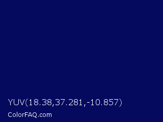 YUV 18.38,37.281,-10.857 Color is a very dark blue color and the nearest color is Gulf Blue #051657. Hex code #060a5e and RGB value is rgb(6,10,94). In RGB color space, this color is composed of 2% red, 4% green, 37% blue, In CMYK color space, this color is composed of 94% cyan, 89% magenta, 0% yellow , 63% black , In HSL color space, this color has a hue angle of 237° , 88% saturation and 20% lightness.