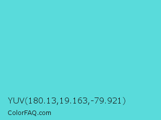 YUV 180.13,19.163,-79.921 Color is a normal cyan color and the nearest color is Viking #64ccdb. Hex code #59dbdb and RGB value is rgb(89,219,219). In RGB color space, this color is composed of 35% red, 86% green, 86% blue, In CMYK color space, this color is composed of 59% cyan, 0% magenta, 0% yellow , 14% black , In HSL color space, this color has a hue angle of 180° , 64% saturation and 60% lightness.