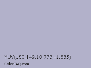 YUV 180.149,10.773,-1.885 Color is a light indigo color and the nearest color is Cadet Blue #a9b2c3. Hex code #b2b1ca and RGB value is rgb(178,177,202). In RGB color space, this color is composed of 70% red, 69% green, 79% blue, In CMYK color space, this color is composed of 12% cyan, 12% magenta, 0% yellow , 21% black , In HSL color space, this color has a hue angle of 242° , 19% saturation and 74% lightness.