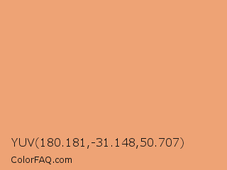 YUV 180.181,-31.148,50.707 Color is a light orange color and the nearest color is Fawn #e5aa70. Hex code #eea375 and RGB value is rgb(238,163,117). In RGB color space, this color is composed of 93% red, 64% green, 46% blue, In CMYK color space, this color is composed of 0% cyan, 32% magenta, 51% yellow , 7% black , In HSL color space, this color has a hue angle of 23° , 78% saturation and 70% lightness.