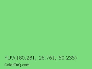 YUV 180.281,-26.761,-50.235 Color is a light green color and the nearest color is Pastel Green #77dd77. Hex code #7bdc7e and RGB value is rgb(123,220,126). In RGB color space, this color is composed of 48% red, 86% green, 49% blue, In CMYK color space, this color is composed of 44% cyan, 0% magenta, 43% yellow , 14% black , In HSL color space, this color has a hue angle of 122° , 58% saturation and 67% lightness.