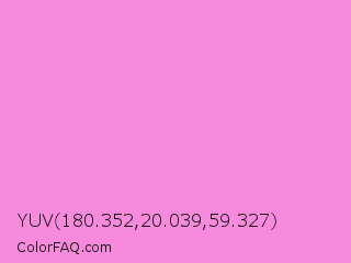 YUV 180.352,20.039,59.327 Color is a light magenta color and the nearest color is Pale Magenta #f984e5. Hex code #f88add and RGB value is rgb(248,138,221). In RGB color space, this color is composed of 97% red, 54% green, 87% blue, In CMYK color space, this color is composed of 0% cyan, 44% magenta, 11% yellow , 3% black , In HSL color space, this color has a hue angle of 315° , 89% saturation and 76% lightness.