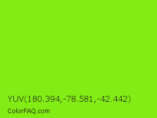 YUV 180.394,-78.581,-42.442 Color is a normal green color and the nearest color is Alien Armpit #84de02. Hex code #84ec15 and RGB value is rgb(132,236,21). In RGB color space, this color is composed of 52% red, 93% green, 8% blue, In CMYK color space, this color is composed of 44% cyan, 0% magenta, 91% yellow , 7% black , In HSL color space, this color has a hue angle of 89° , 85% saturation and 50% lightness.