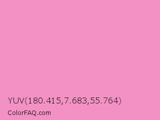YUV 180.415,7.683,55.764 Color is a light rose color and the nearest color is Pastel Magenta #f49ac2. Hex code #f491c4 and RGB value is rgb(244,145,196). In RGB color space, this color is composed of 96% red, 57% green, 77% blue, In CMYK color space, this color is composed of 0% cyan, 41% magenta, 20% yellow , 4% black , In HSL color space, this color has a hue angle of 329° , 82% saturation and 76% lightness.