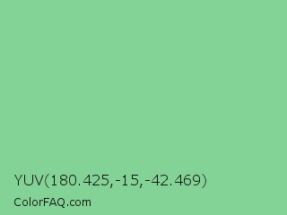 YUV 180.425,-15,-42.469 Color is a light green color and the nearest color is De York #7ac488. Hex code #84d396 and RGB value is rgb(132,211,150). In RGB color space, this color is composed of 52% red, 83% green, 59% blue, In CMYK color space, this color is composed of 37% cyan, 0% magenta, 29% yellow , 17% black , In HSL color space, this color has a hue angle of 134° , 47% saturation and 67% lightness.