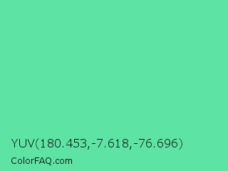 YUV 180.453,-7.618,-76.696 Color is a light green color and the nearest color is Medium Aquamarine #66ddaa. Hex code #5de4a5 and RGB value is rgb(93,228,165). In RGB color space, this color is composed of 36% red, 89% green, 65% blue, In CMYK color space, this color is composed of 59% cyan, 0% magenta, 28% yellow , 11% black , In HSL color space, this color has a hue angle of 152° , 71% saturation and 63% lightness.