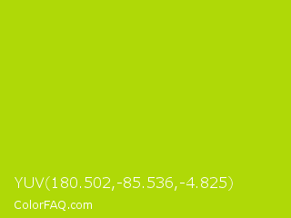 YUV 180.502,-85.536,-4.825 Color is a normal lime color and the nearest color is Vivid Lime Green #a6d608. Hex code #afd907 and RGB value is rgb(175,217,7). In RGB color space, this color is composed of 69% red, 85% green, 3% blue, In CMYK color space, this color is composed of 19% cyan, 0% magenta, 97% yellow , 15% black , In HSL color space, this color has a hue angle of 72° , 94% saturation and 44% lightness.
