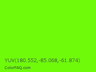 YUV 180.552,-85.068,-61.874 Color is a normal green color and the nearest color is Bright Green #66ff00. Hex code #6efa08 and RGB value is rgb(110,250,8). In RGB color space, this color is composed of 43% red, 98% green, 3% blue, In CMYK color space, this color is composed of 56% cyan, 0% magenta, 97% yellow , 2% black , In HSL color space, this color has a hue angle of 95° , 96% saturation and 51% lightness.