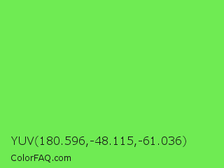 YUV 180.596,-48.115,-61.036 Color is a light green color and the nearest color is Screamin Green #66ff66. Hex code #6feb53 and RGB value is rgb(111,235,83). In RGB color space, this color is composed of 44% red, 92% green, 33% blue, In CMYK color space, this color is composed of 53% cyan, 0% magenta, 65% yellow , 8% black , In HSL color space, this color has a hue angle of 109° , 79% saturation and 62% lightness.