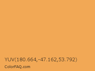 YUV 180.664,-47.162,53.792 Color is a light orange color and the nearest color is Sandy Brown #f4a460. Hex code #f2a855 and RGB value is rgb(242,168,85). In RGB color space, this color is composed of 95% red, 66% green, 33% blue, In CMYK color space, this color is composed of 0% cyan, 31% magenta, 65% yellow , 5% black , In HSL color space, this color has a hue angle of 32° , 86% saturation and 64% lightness.