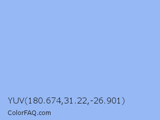 YUV 180.674,31.22,-26.901 Color is a light blue color and the nearest color is Jordy Blue #8ab9f1. Hex code #96b8f4 and RGB value is rgb(150,184,244). In RGB color space, this color is composed of 59% red, 72% green, 96% blue, In CMYK color space, this color is composed of 39% cyan, 25% magenta, 0% yellow , 4% black , In HSL color space, this color has a hue angle of 218° , 81% saturation and 77% lightness.
