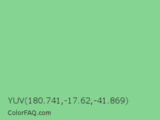 YUV 180.741,-17.62,-41.869 Color is a light green color and the nearest color is De York #7ac488. Hex code #85d491 and RGB value is rgb(133,212,145). In RGB color space, this color is composed of 52% red, 83% green, 57% blue, In CMYK color space, this color is composed of 37% cyan, 0% magenta, 32% yellow , 17% black , In HSL color space, this color has a hue angle of 129° , 48% saturation and 68% lightness.
