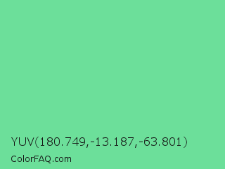 YUV 180.749,-13.187,-63.801 Color is a light green color and the nearest color is Medium Aquamarine #66ddaa. Hex code #6cdf9a and RGB value is rgb(108,223,154). In RGB color space, this color is composed of 42% red, 87% green, 60% blue, In CMYK color space, this color is composed of 52% cyan, 0% magenta, 31% yellow , 13% black , In HSL color space, this color has a hue angle of 144° , 64% saturation and 65% lightness.