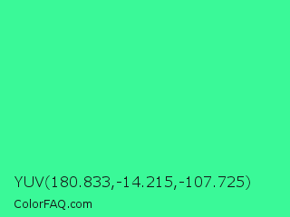 YUV 180.833,-14.215,-107.725 Color is a normal green color and the nearest color is Eucalyptus #44d7a8. Hex code #3af998 and RGB value is rgb(58,249,152). In RGB color space, this color is composed of 23% red, 98% green, 60% blue, In CMYK color space, this color is composed of 77% cyan, 0% magenta, 39% yellow , 2% black , In HSL color space, this color has a hue angle of 150° , 94% saturation and 60% lightness.