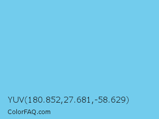 YUV 180.852,27.681,-58.629 Color is a light blue color and the nearest color is Sky Blue #76d7ea. Hex code #72cced and RGB value is rgb(114,204,237). In RGB color space, this color is composed of 45% red, 80% green, 93% blue, In CMYK color space, this color is composed of 52% cyan, 14% magenta, 0% yellow , 7% black , In HSL color space, this color has a hue angle of 196° , 77% saturation and 69% lightness.