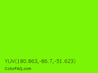 YUV 180.863,-86.7,-51.623 Color is a normal green color and the nearest color is Lawn Green #7cfc00. Hex code #7af505 and RGB value is rgb(122,245,5). In RGB color space, this color is composed of 48% red, 96% green, 2% blue, In CMYK color space, this color is composed of 50% cyan, 0% magenta, 98% yellow , 4% black , In HSL color space, this color has a hue angle of 91° , 96% saturation and 49% lightness.