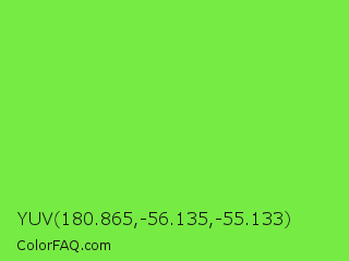 YUV 180.865,-56.135,-55.133 Color is a normal green color and the nearest color is Kiwi #8ee53f. Hex code #76eb43 and RGB value is rgb(118,235,67). In RGB color space, this color is composed of 46% red, 92% green, 26% blue, In CMYK color space, this color is composed of 50% cyan, 0% magenta, 71% yellow , 8% black , In HSL color space, this color has a hue angle of 102° , 81% saturation and 59% lightness.