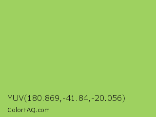 YUV 180.869,-41.84,-20.056 Color is a normal green color and the nearest color is Middle Green Yellow #acbf60. Hex code #9ed160 and RGB value is rgb(158,209,96). In RGB color space, this color is composed of 62% red, 82% green, 38% blue, In CMYK color space, this color is composed of 24% cyan, 0% magenta, 54% yellow , 18% black , In HSL color space, this color has a hue angle of 87° , 55% saturation and 60% lightness.