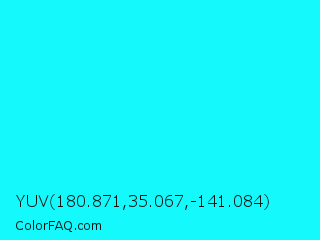 YUV 180.871,35.067,-141.084 Color is a normal cyan color and the nearest color is Loeen #15f2fd. Hex code #14f9fc and RGB value is rgb(20,249,252). In RGB color space, this color is composed of 8% red, 98% green, 99% blue, In CMYK color space, this color is composed of 92% cyan, 1% magenta, 0% yellow , 1% black , In HSL color space, this color has a hue angle of 181° , 97% saturation and 53% lightness.