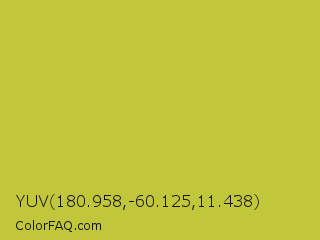 YUV 180.958,-60.125,11.438 Color is a normal yellow color and the nearest color is Earls Green #c9b93b. Hex code #c2c63b and RGB value is rgb(194,198,59). In RGB color space, this color is composed of 76% red, 78% green, 23% blue, In CMYK color space, this color is composed of 2% cyan, 0% magenta, 70% yellow , 22% black , In HSL color space, this color has a hue angle of 62° , 55% saturation and 50% lightness.