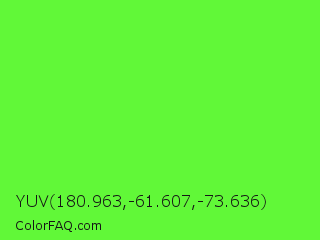 YUV 180.963,-61.607,-73.636 Color is a normal green color and the nearest color is Spring Frost #87ff2a. Hex code #61f838 and RGB value is rgb(97,248,56). In RGB color space, this color is composed of 38% red, 97% green, 22% blue, In CMYK color space, this color is composed of 61% cyan, 0% magenta, 77% yellow , 3% black , In HSL color space, this color has a hue angle of 107° , 93% saturation and 60% lightness.