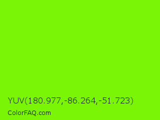 YUV 180.977,-86.264,-51.723 Color is a normal green color and the nearest color is Lawn Green #7cfc00. Hex code #7af506 and RGB value is rgb(122,245,6). In RGB color space, this color is composed of 48% red, 96% green, 2% blue, In CMYK color space, this color is composed of 50% cyan, 0% magenta, 98% yellow , 4% black , In HSL color space, this color has a hue angle of 91° , 95% saturation and 49% lightness.