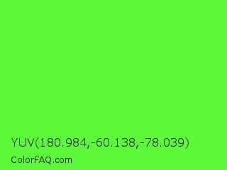 YUV 180.984,-60.138,-78.039 Color is a light green color and the nearest color is Screamin Green #66ff66. Hex code #5cfa3b and RGB value is rgb(92,250,59). In RGB color space, this color is composed of 36% red, 98% green, 23% blue, In CMYK color space, this color is composed of 63% cyan, 0% magenta, 76% yellow , 2% black , In HSL color space, this color has a hue angle of 110° , 95% saturation and 61% lightness.