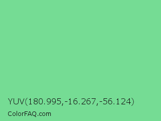 YUV 180.995,-16.267,-56.124 Color is a light green color and the nearest color is Very Light Malachite Green #64e986. Hex code #75dc94 and RGB value is rgb(117,220,148). In RGB color space, this color is composed of 46% red, 86% green, 58% blue, In CMYK color space, this color is composed of 47% cyan, 0% magenta, 33% yellow , 14% black , In HSL color space, this color has a hue angle of 138° , 60% saturation and 66% lightness.