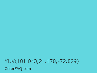 YUV 181.043,21.178,-72.829 Color is a light cyan color and the nearest color is Viking #64ccdb. Hex code #62d7e0 and RGB value is rgb(98,215,224). In RGB color space, this color is composed of 38% red, 84% green, 88% blue, In CMYK color space, this color is composed of 56% cyan, 4% magenta, 0% yellow , 12% black , In HSL color space, this color has a hue angle of 184° , 67% saturation and 63% lightness.