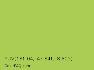 YUV 181.04,-47.841,-8.805 Color is a normal lime color and the nearest color is Conifer #acdd4d. Hex code #abcd54 and RGB value is rgb(171,205,84). In RGB color space, this color is composed of 67% red, 80% green, 33% blue, In CMYK color space, this color is composed of 17% cyan, 0% magenta, 59% yellow , 20% black , In HSL color space, this color has a hue angle of 77° , 55% saturation and 57% lightness.