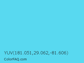 YUV 181.051,29.062,-81.606 Color is a light cyan color and the nearest color is Turquoise Blue #6cdae7. Hex code #58d9f0 and RGB value is rgb(88,217,240). In RGB color space, this color is composed of 35% red, 85% green, 94% blue, In CMYK color space, this color is composed of 63% cyan, 10% magenta, 0% yellow , 6% black , In HSL color space, this color has a hue angle of 189° , 84% saturation and 64% lightness.