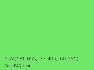 YUV 181.055,-37.495,-60.561 Color is a light green color and the nearest color is Pastel Green #77dd77. Hex code #70e769 and RGB value is rgb(112,231,105). In RGB color space, this color is composed of 44% red, 91% green, 41% blue, In CMYK color space, this color is composed of 52% cyan, 0% magenta, 55% yellow , 9% black , In HSL color space, this color has a hue angle of 117° , 72% saturation and 66% lightness.