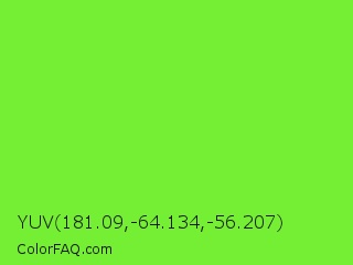YUV 181.09,-64.134,-56.207 Color is a normal green color and the nearest color is Spring Frost #87ff2a. Hex code #75ef33 and RGB value is rgb(117,239,51). In RGB color space, this color is composed of 46% red, 94% green, 20% blue, In CMYK color space, this color is composed of 51% cyan, 0% magenta, 79% yellow , 6% black , In HSL color space, this color has a hue angle of 99° , 85% saturation and 57% lightness.