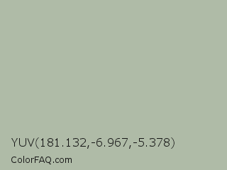YUV 181.132,-6.967,-5.378 Color is a light green color and the nearest color is Eagle #b6baa4. Hex code #afbba7 and RGB value is rgb(175,187,167). In RGB color space, this color is composed of 69% red, 73% green, 65% blue, In CMYK color space, this color is composed of 6% cyan, 0% magenta, 11% yellow , 27% black , In HSL color space, this color has a hue angle of 96° , 13% saturation and 69% lightness.