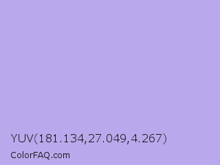 YUV 181.134,27.049,4.267 Color is a light indigo color and the nearest color is Biloba Flower #b2a1ea. Hex code #baa8ec and RGB value is rgb(186,168,236). In RGB color space, this color is composed of 73% red, 66% green, 93% blue, In CMYK color space, this color is composed of 21% cyan, 29% magenta, 0% yellow , 7% black , In HSL color space, this color has a hue angle of 256° , 64% saturation and 79% lightness.