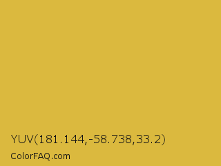 YUV 181.144,-58.738,33.2 Color is a normal yellow color and the nearest color is Anzac #e0b646. Hex code #dbb93e and RGB value is rgb(219,185,62). In RGB color space, this color is composed of 86% red, 73% green, 24% blue, In CMYK color space, this color is composed of 0% cyan, 16% magenta, 72% yellow , 14% black , In HSL color space, this color has a hue angle of 47° , 69% saturation and 55% lightness.