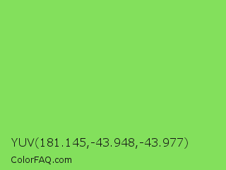 YUV 181.145,-43.948,-43.977 Color is a light green color and the nearest color is Pastel Green #77dd77. Hex code #83e05c and RGB value is rgb(131,224,92). In RGB color space, this color is composed of 51% red, 88% green, 36% blue, In CMYK color space, this color is composed of 42% cyan, 0% magenta, 59% yellow , 12% black , In HSL color space, this color has a hue angle of 102° , 68% saturation and 62% lightness.