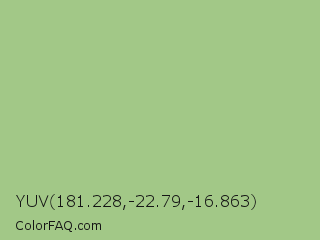 YUV 181.228,-22.79,-16.863 Color is a light green color and the nearest color is Swamp Green #acb78e. Hex code #a2c887 and RGB value is rgb(162,200,135). In RGB color space, this color is composed of 64% red, 78% green, 53% blue, In CMYK color space, this color is composed of 19% cyan, 0% magenta, 33% yellow , 22% black , In HSL color space, this color has a hue angle of 95° , 37% saturation and 66% lightness.