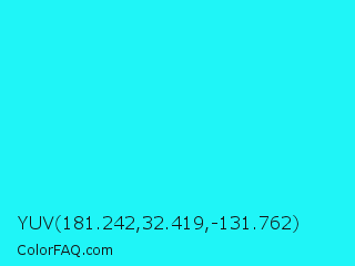 YUV 181.242,32.419,-131.762 Color is a normal cyan color and the nearest color is Loeen #15f2fd. Hex code #1ff5f7 and RGB value is rgb(31,245,247). In RGB color space, this color is composed of 12% red, 96% green, 97% blue, In CMYK color space, this color is composed of 87% cyan, 1% magenta, 0% yellow , 3% black , In HSL color space, this color has a hue angle of 181° , 93% saturation and 55% lightness.