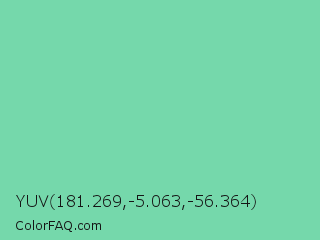 YUV 181.269,-5.063,-56.364 Color is a light green color and the nearest color is Medium Aquamarine #66ddaa. Hex code #75d8ab and RGB value is rgb(117,216,171). In RGB color space, this color is composed of 46% red, 85% green, 67% blue, In CMYK color space, this color is composed of 46% cyan, 0% magenta, 21% yellow , 15% black , In HSL color space, this color has a hue angle of 153° , 56% saturation and 65% lightness.