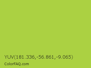 YUV 181.336,-56.861,-9.065 Color is a normal lime color and the nearest color is Android Green #a4c639. Hex code #abd142 and RGB value is rgb(171,209,66). In RGB color space, this color is composed of 67% red, 82% green, 26% blue, In CMYK color space, this color is composed of 18% cyan, 0% magenta, 68% yellow , 18% black , In HSL color space, this color has a hue angle of 76° , 61% saturation and 54% lightness.