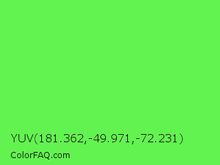 YUV 181.362,-49.971,-72.231 Color is a light green color and the nearest color is Screamin Green #66ff66. Hex code #63f350 and RGB value is rgb(99,243,80). In RGB color space, this color is composed of 39% red, 95% green, 31% blue, In CMYK color space, this color is composed of 59% cyan, 0% magenta, 67% yellow , 5% black , In HSL color space, this color has a hue angle of 113° , 87% saturation and 63% lightness.