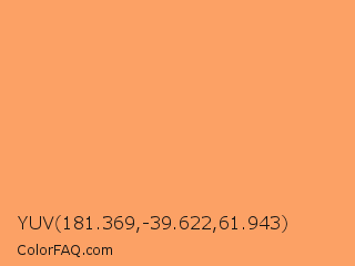 YUV 181.369,-39.622,61.943 Color is a light orange color and the nearest color is Atomic Tangerine #ff9966. Hex code #fca165 and RGB value is rgb(252,161,101). In RGB color space, this color is composed of 99% red, 63% green, 40% blue, In CMYK color space, this color is composed of 0% cyan, 36% magenta, 60% yellow , 1% black , In HSL color space, this color has a hue angle of 24° , 96% saturation and 69% lightness.