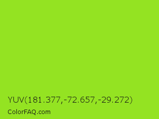 YUV 181.377,-72.657,-29.272 Color is a normal green color and the nearest color is Atlantis #97cd2d. Hex code #94e322 and RGB value is rgb(148,227,34). In RGB color space, this color is composed of 58% red, 89% green, 13% blue, In CMYK color space, this color is composed of 35% cyan, 0% magenta, 85% yellow , 11% black , In HSL color space, this color has a hue angle of 85° , 78% saturation and 51% lightness.